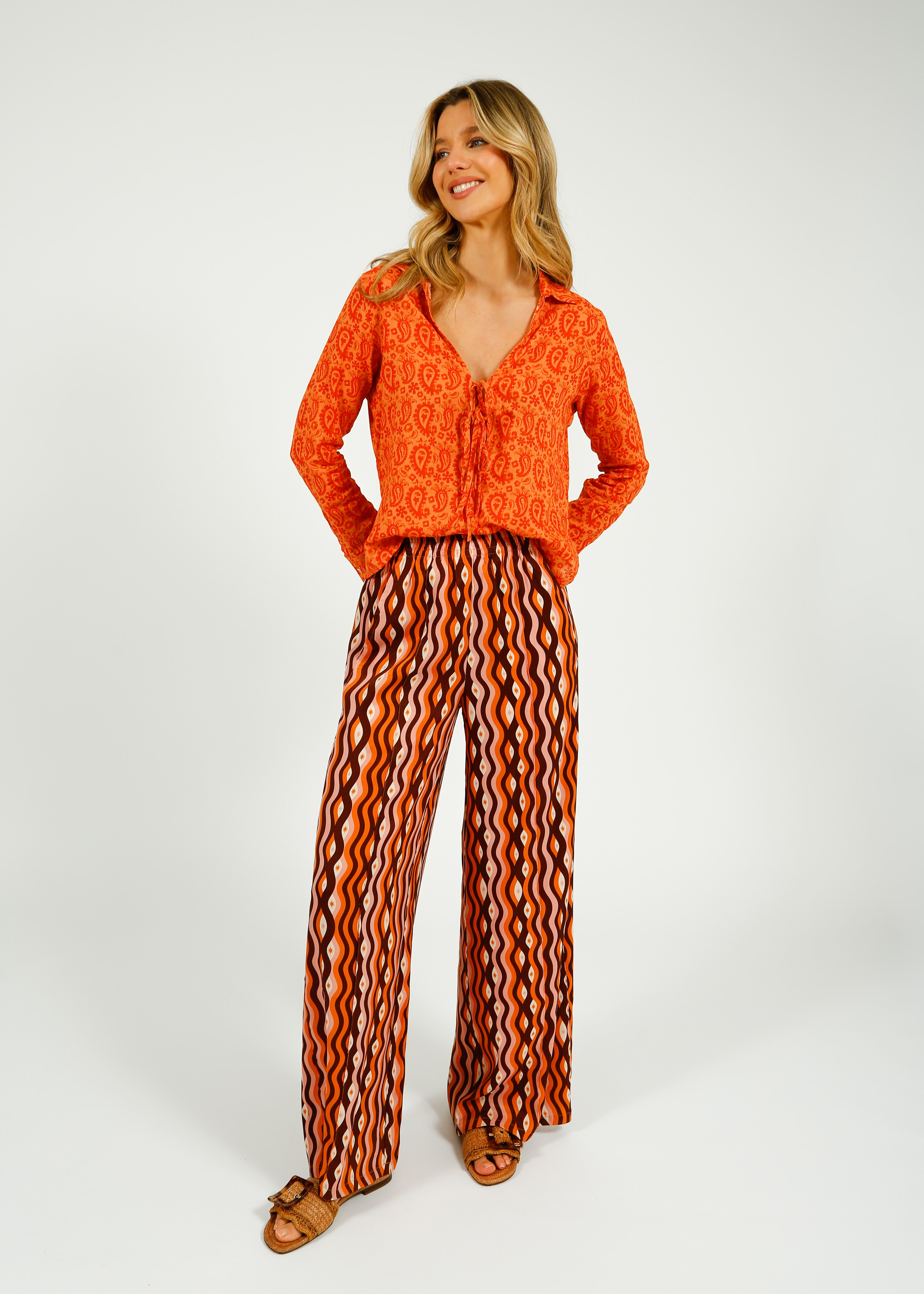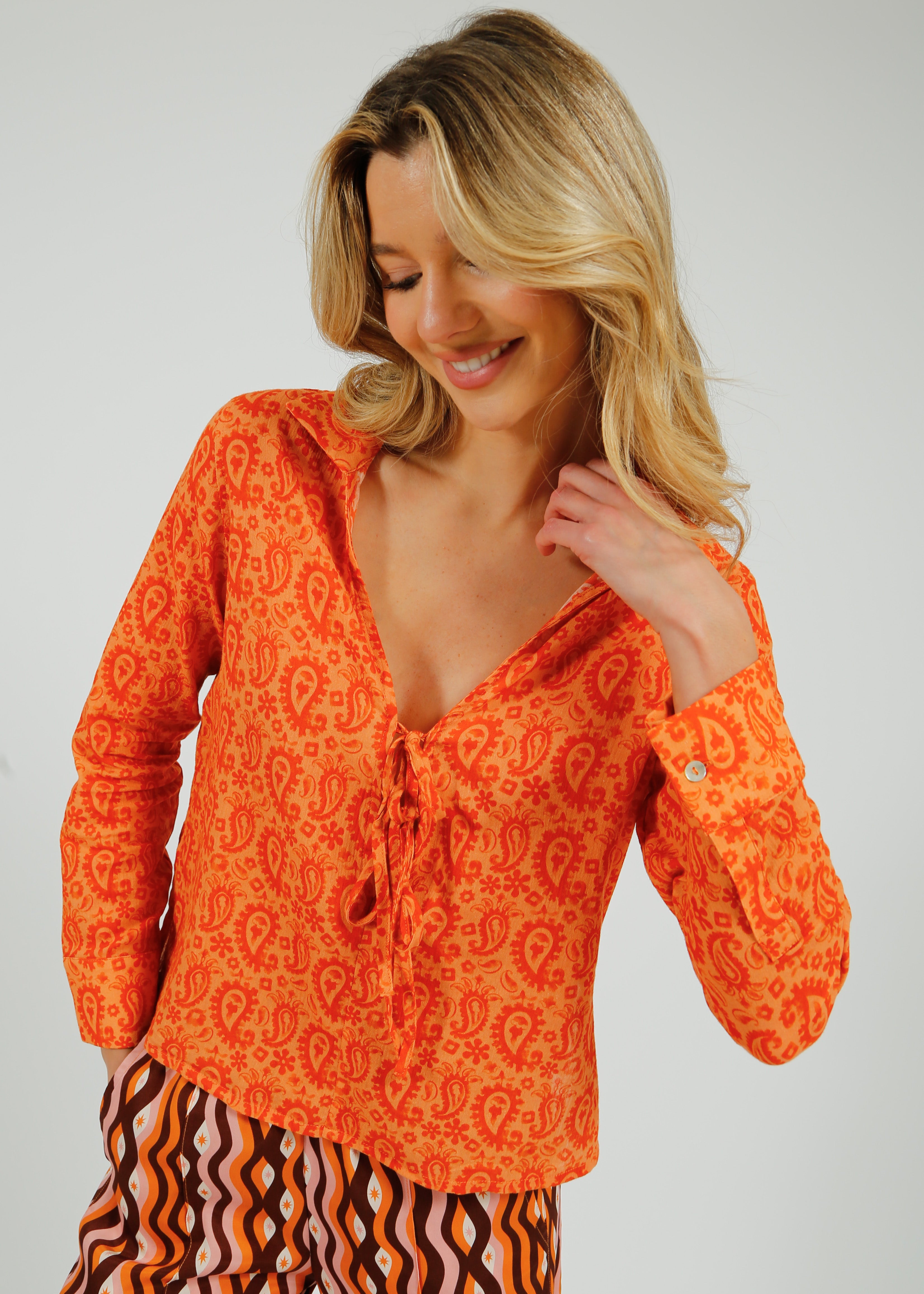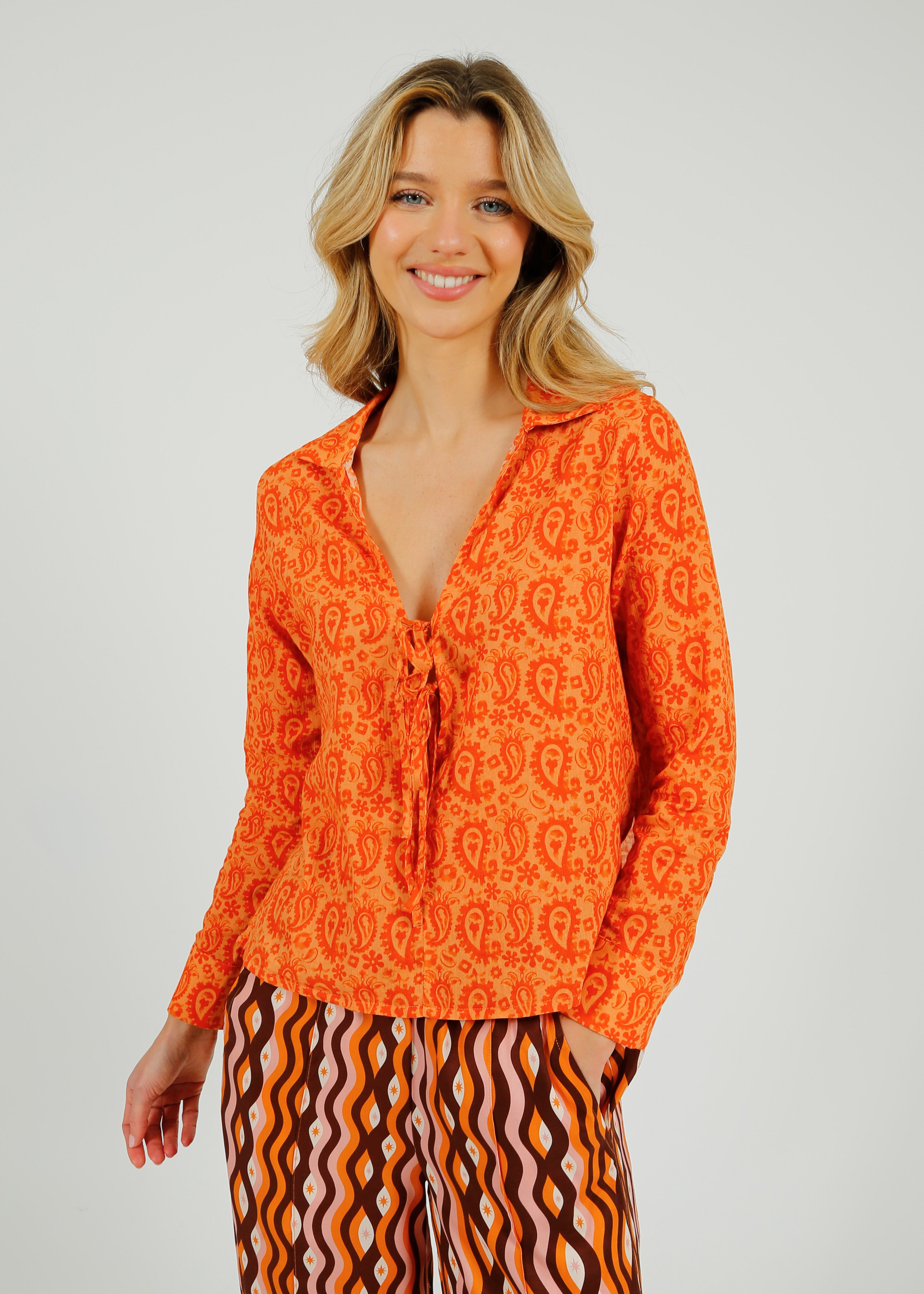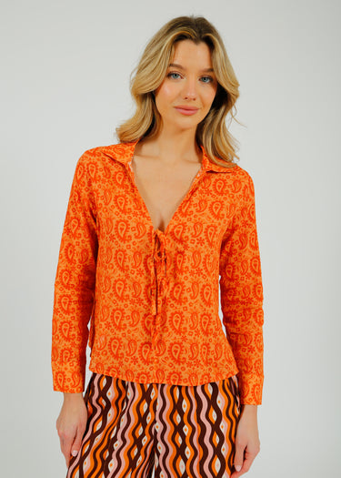 The Eve Shirt in Paisley is a lightweight cotton voile shirt designed for breathable comfort and effortless summer styling. Featuring a vibrant orange paisley print, this relaxed-fit blouse is finished with a classic collar, long sleeves, and a flattering V-neckline with a delicate tie detail for a flexibility. Crafted from airy cotton voile for a natural, lightweight drape, it’s perfect for warm-weather dressing and holidays. Easy to style with trousers, skirts, or shorts, this paisley print shirt is a versatile wardrobe staple for chic, laid-back resort and everyday wear.