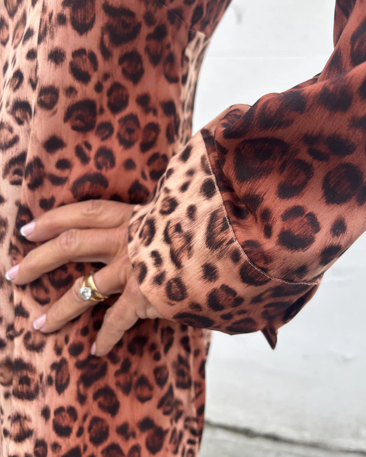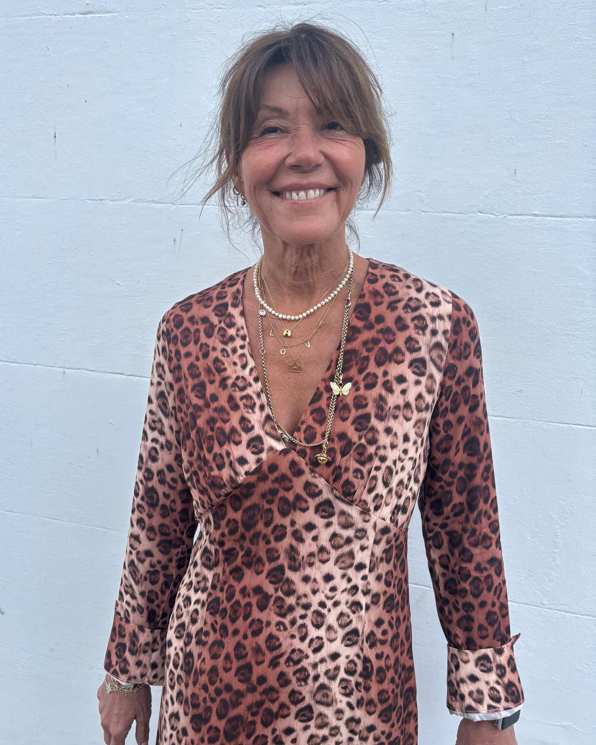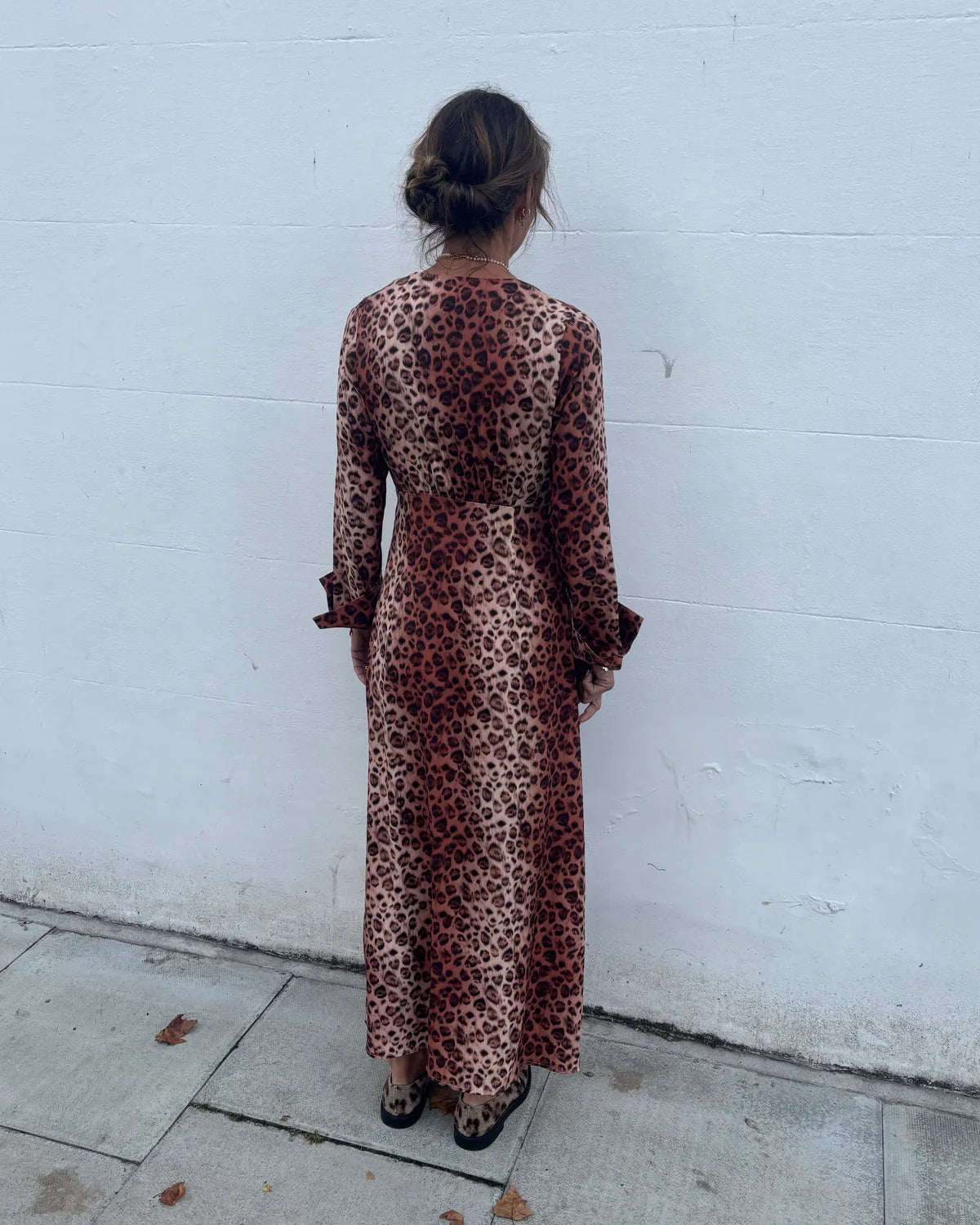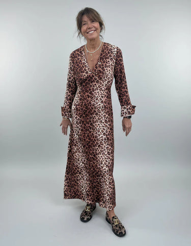 The Uma Dress by Primrose Park London embodies modern femininity with a touch of boldness. Crafted from fluid satin, this elegant dress features an all-over leopard print in rich caramel and chocolate tones, creating a look that is both timeless and versatile. Designed with a flattering V-neckline, long sleeves with turned-up cuffs, and a gently skimming silhouette, it flatters every figure. The maxi length adds effortless sophistication, making the Primrose Park Uma Dress in Leopard perfect for both day and evening occasions. Style it casually with trainers for a laid-back look, or elevate with heels and statement jewellery for refined evening glamour.